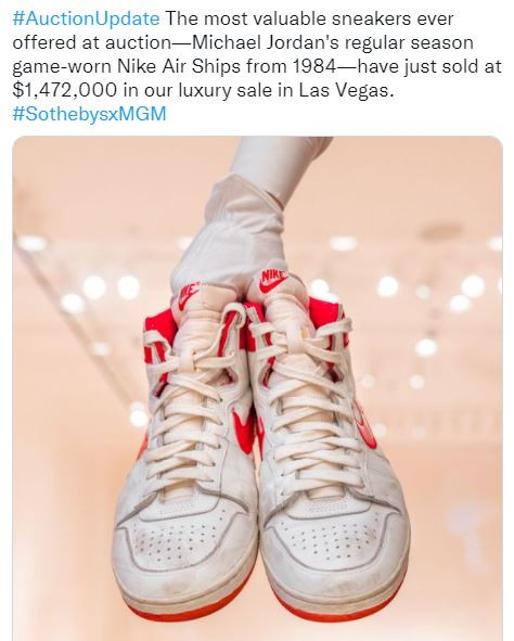 Penjualan Nike Air Ships 1984 milik MJ, mengalahkan rekor lelang yang sebelumnya. Pada bulan Agustus 2020, Nike Air Jordan yang dipakai bertanding oleh MJ, laku seharga AS$615 ribu, atau setara 8,7 miliar rupiah.