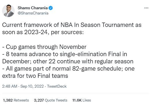 Setelah melalui debat terbuka, dan pembahasan di internal liga, akhirnya NBA berhasil membuat rancangan mid-season tournament tersebut. Ada tiga poin penting dalam rancangan turnamen yang wacananya bakal bergulir di musim 2023-2024 nanti. Seperti yang ditulis oleh Shams Charania di akun Twitter-nya.