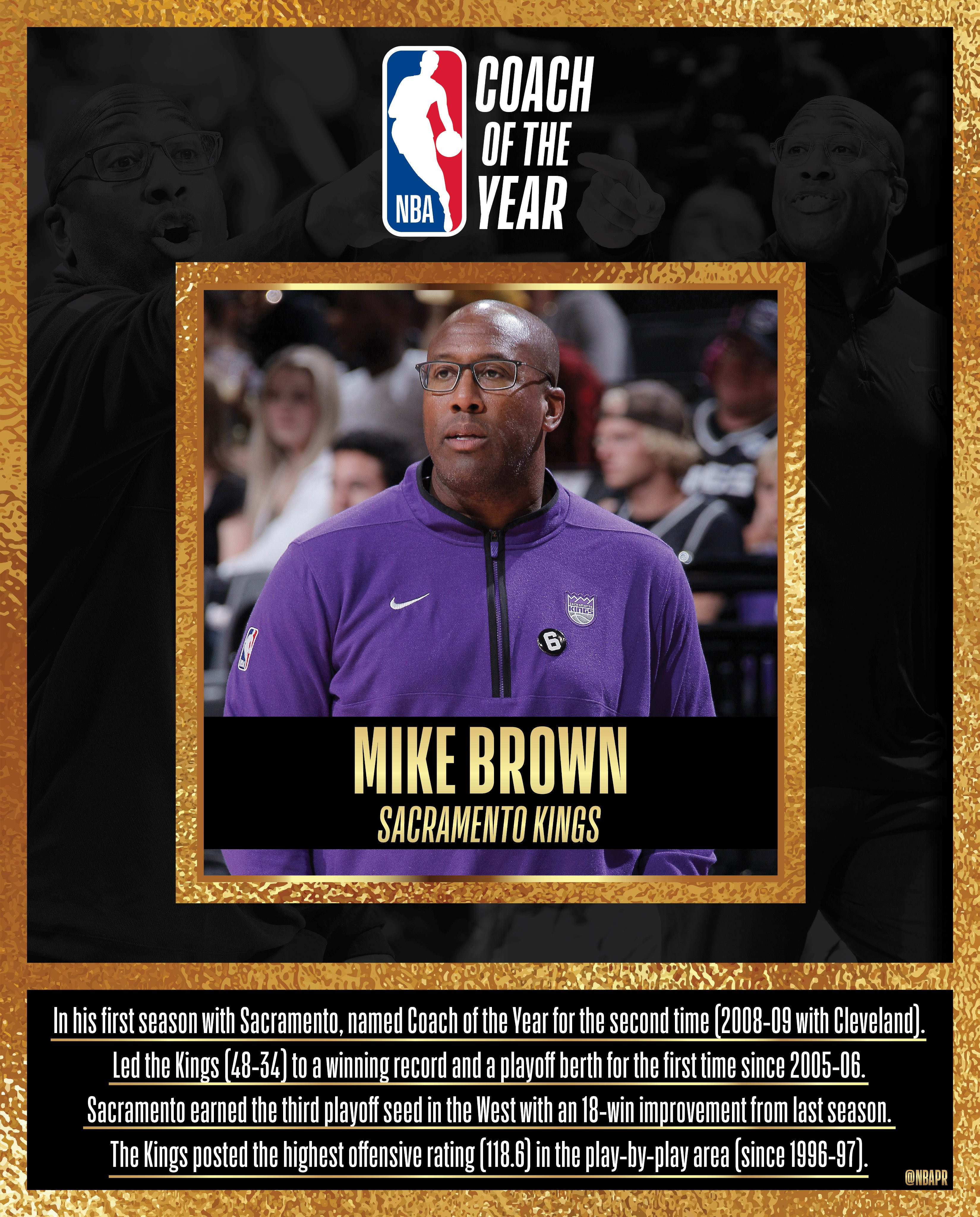 Mike Brown menjadi pelatih terbaik NBA musim ini. Pelatih Sacramento Kings itu menang telak atas Mark Daigneault (Oklahoma City Thunder) dan Joe Mazzulla (Boston Celtics). Brown mendapat suara sempurna sebagai urutan pertama dari 100 anggota panel.