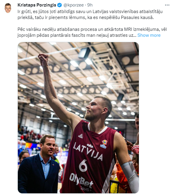 Pekan lalu, sebuah berita menyebut bahwa pemain Boston Celtics Kristaps Porzingis kemungkinan akan melewatkan Piala Dunia FIBA 2023 karena cedera kaki. Tetapi timnas Latvia dengan cepat dan tegas membantah laporan tersebut, mengatakan Porzingis berencana untuk bermain. Kabar terbaru adalah Porzingis sendiri yang mengumumkan lewat media sosial bahwa dirinya tidak akan bermain di Piala Dunia FIBA 2023.