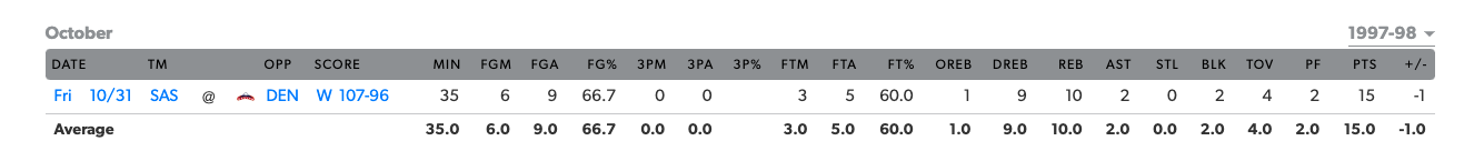 Sedangkan Duncan menjalani debut musim reguler pada 31 Oktober 1997 mengalahkan Denver Nuggets 107-96. Duncan mencetak 15 poin dari 6/9 tembakan, dan 2 asis. Angka dari total poin, field goals, dan asis itu persis dengan raihan Wemby.