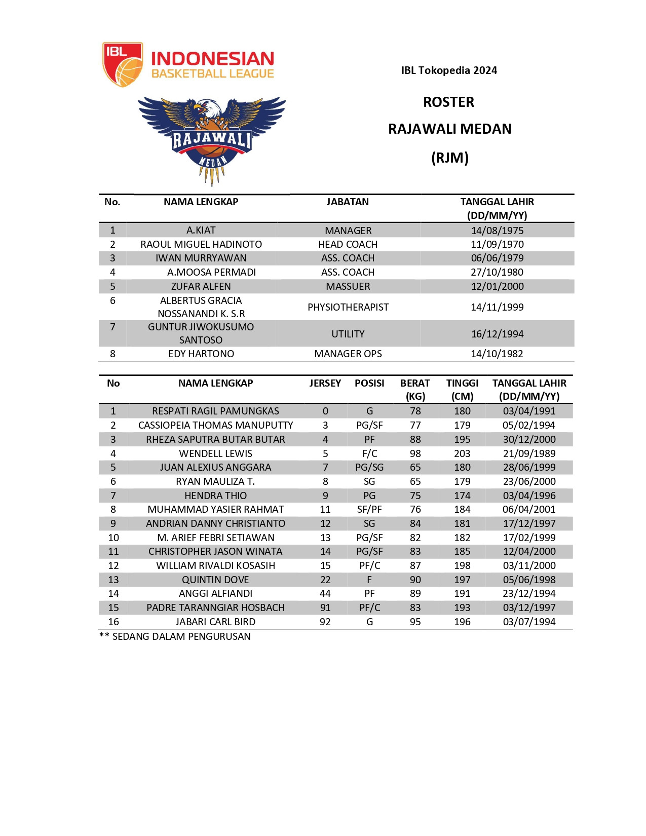 Untuk lebih mengetahui siapa saja pemain-pemain yang ada dalam tim kesayangan Anda, maka kami menyajikan roster lengkap IBL Tokopedia 2024, di bawah ini: