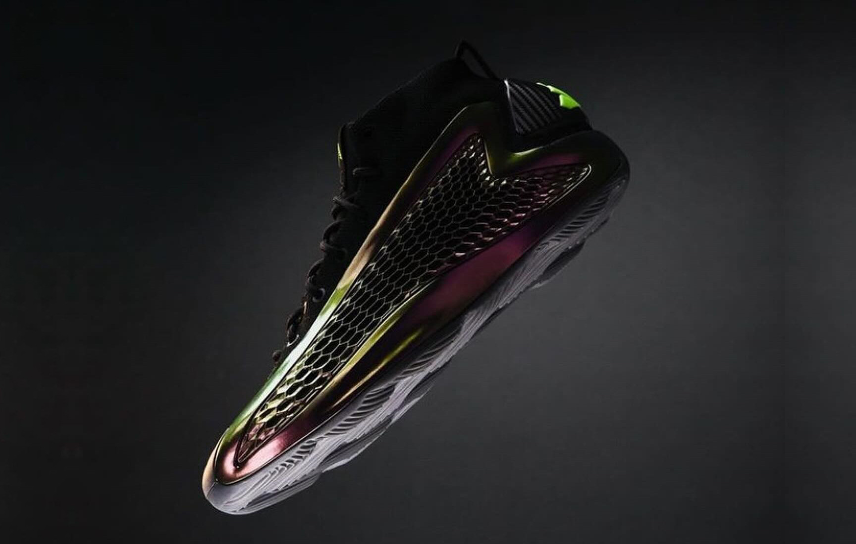 Sepatu ini memiliki palet warna Metallic Burgundy, Black, dan Lime Green yang mencolok. Adidas AE 1 "All-Star" menampilkan inner bootie rajutan Black Primeblue. Lapisan metalik yang berubah warna menambah kesan anggun, menciptakan visual menawan di lapangan basket.