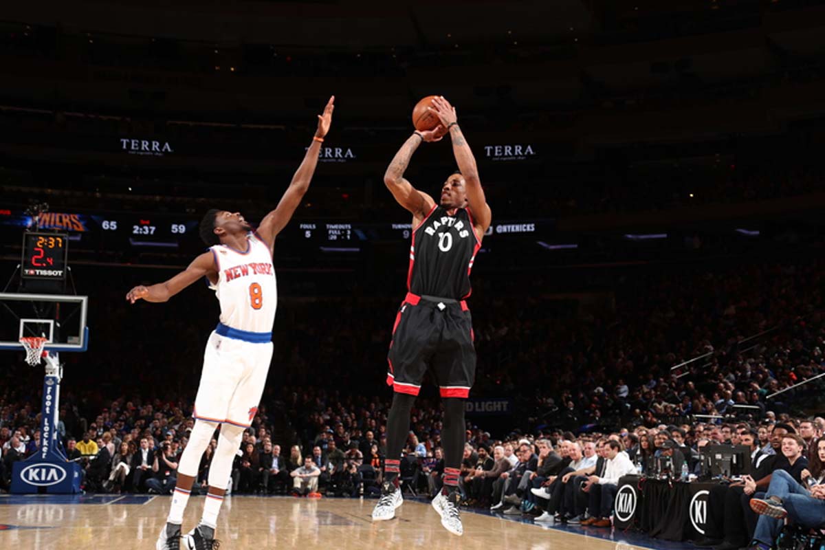 Banyak bertahan dan membuka ruang tembak untuk DeMar DeRozan. Itulah cara yang dilakukan Toronto Raptors tanpa Kyle Lowry saat berhadapan dengan New York Knicks, Senin malam waktu Amerika Serikat.