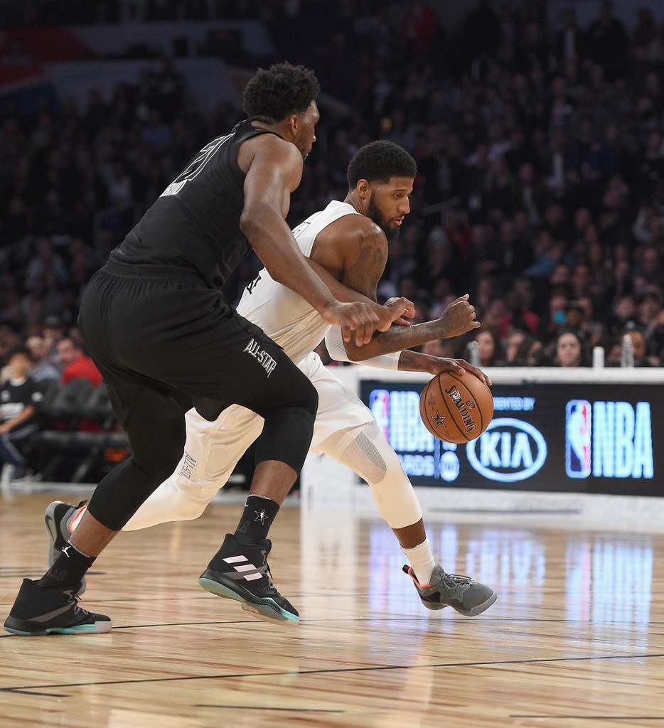Joel Embiid (kiri) menggunakan adidas Mad Bounce sedangkan Paul George (kanan) nyaman memakai Nike PG2