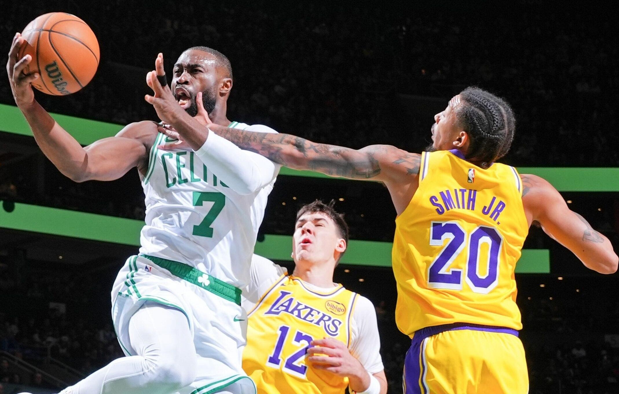 Dengan pertandingan yang tak terkendali di kuarter keempat dan ayahnya yang hanya menonton dari bangku cadangan dengan pakaian kasual, Bronny James masuk dengan sisa waktu 6:38. Ia mencetak 2 dari 3 tembakan dengan 5 poin dan 1 asis dalam debutnya di TD Garden. Ia tidak ikut dalam lawatan Lakers ke Boston musim lalu.