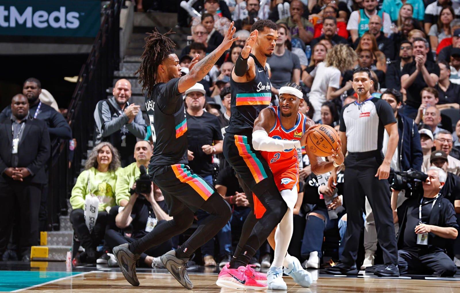 Spurs pada dasarnya melakukan pertaruhan. Shai akan dijaga bergantian oleh Castle atau Fox. Castle yang memang solid dalam bertahan menjadi opsi pertama. Namun, keduanya tidak melakukan banyak upaya memaksakan diri. Langkah pertama mencegah Shai mendapatkan bola dengan mudah. Namun, kalau sudah lewat, kalau tampaknya Shai sudah akan kembali ke mid-range dan mengalahkan Castle atau Fox, mereka akan cenderung melepaskan Shai menembak. Tidak ada upaya foul tambahan. Dalam dua pertemuan, Shai total hanya mendapat 9 tembakan gratis (meleset 1).