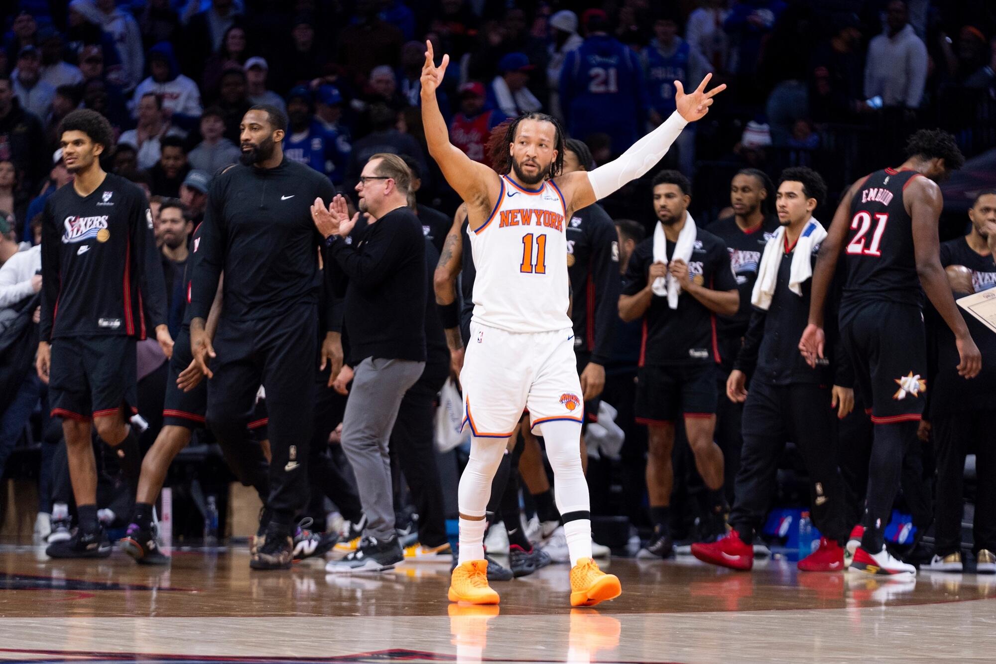 Brunson melambaikan tangan sedikit setelah ia mencetak tembakan tripoin untuk keunggulan 84-72. Joel Embiid mencoba membangkitkan semangat Sixers dan tembakan tripoinnya di kuarter keempat, dibantu oleh pelanggaran keenam Karl-AnthonyTowns, memperkecil selisih menjadi 98-92.