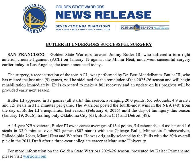 "Pemain depan Golden State Warriors, Jimmy Butler III, yang mengalami robekan ligamen anterior cruciate (ACL) kanan pada 19 Januari melawan Miami Heat , telah menjalani operasi yang sukses hari ini di Los Angeles, demikian diumumkan tim tersebut hari ini," bunyi pernyataan Warriors. "Operasi tersebut, rekonstruksi ACL yang robek, dilakukan oleh Dr. Bert Mandelbaum. Butler III, yang telah absen dalam sembilan pertandingan terakhir, akan absen hingga akhir musim 2025-2026 dan akan segera memulai rehabilitasi. Ia diharapkan pulih sepenuhnya, dan informasi terbaru tentang perkembangannya akan diberikan pada awal musim depan."