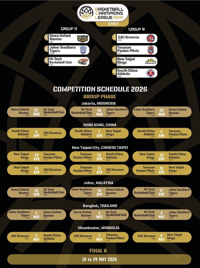 Jadwal dan pembagian grup babak penyisihan FIBA Basketball Champions League (BCL) Asia-East 2026 telah dirilis. Dewa United Banten akan menjadi wakil Indonesia untuk edisi kali ini. Mereka tergabung di Grup A bersama juara Malaysia dan juara Thailand.