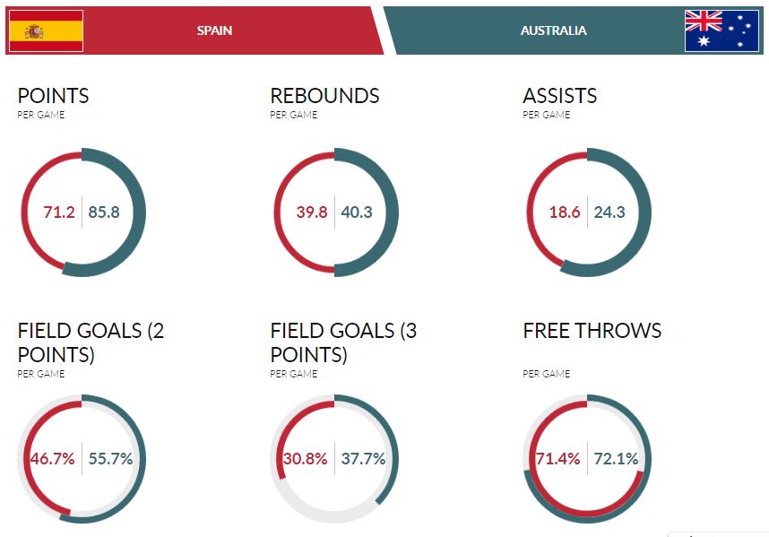 Di babak semifinal, kedua negara tersebut bertemu. Australia diunggulkan untuk menang. Sebab dari catatan statistik mereka lebih baik. Faktornya tentu keberadaan Liz Cambage. Salah satu kandidat MVP Piala Dunia Wanita tahun ini mencetak 25,8 poin dan 8,5 rebound per pertandingan. Australia juga punya akurasi yang baik untuk dua poin, tripoin dan tembakan bebas. Tetapi ada faktor yang tidak dimiliki Australia yaitu penonton. Tentunya sebagai tuan rumah Spanyol lebih unggul dari sisi itu. Mental bertanding pemain berlipat ganda bila tampil di hadapan pendukungnya sendiri. Ini bisa jadi salah satu faktor Spanyol bisa menundukkan Australia. Tapi di atas kertas, Australia lebih baik.