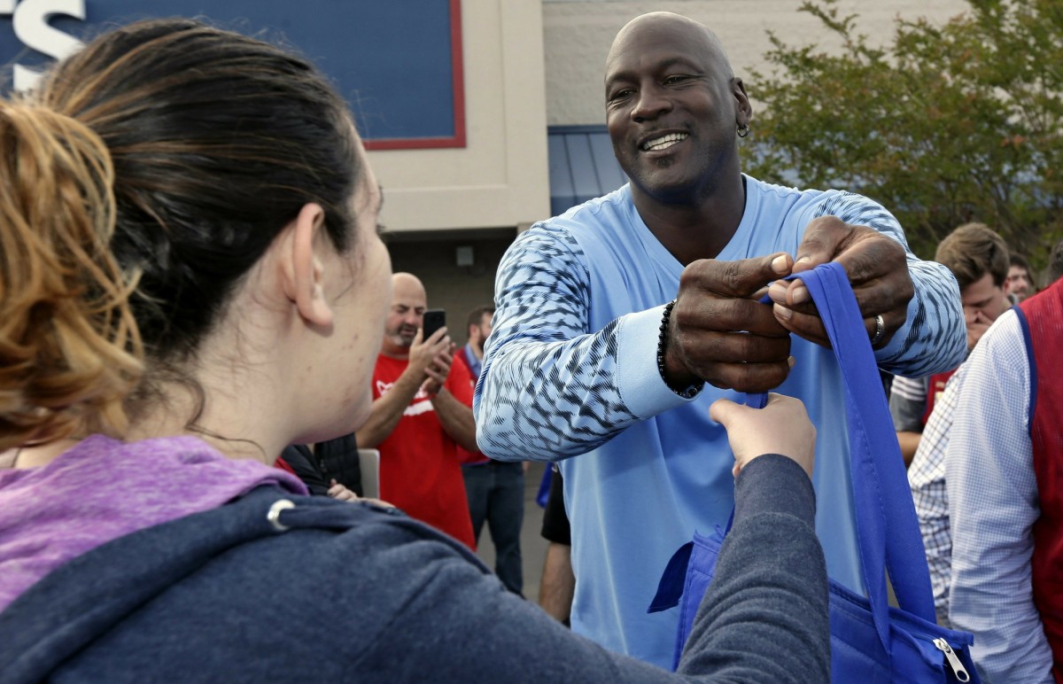 Jordan datang menggunakan baju berwarna timnya semasa kuliah, North Carolina Tar Heel. Memberi kejutan kepada para korban dengan membawa ratusan makanan cepat saji dan sepatu Air Jordan untuk anak-anak. “Saya bisa saja berdonasi sepanjang hari. Ini juga berguna untuk menyadarkan bahwa saya hanyalah manusia biasa,” tutur Jordan.