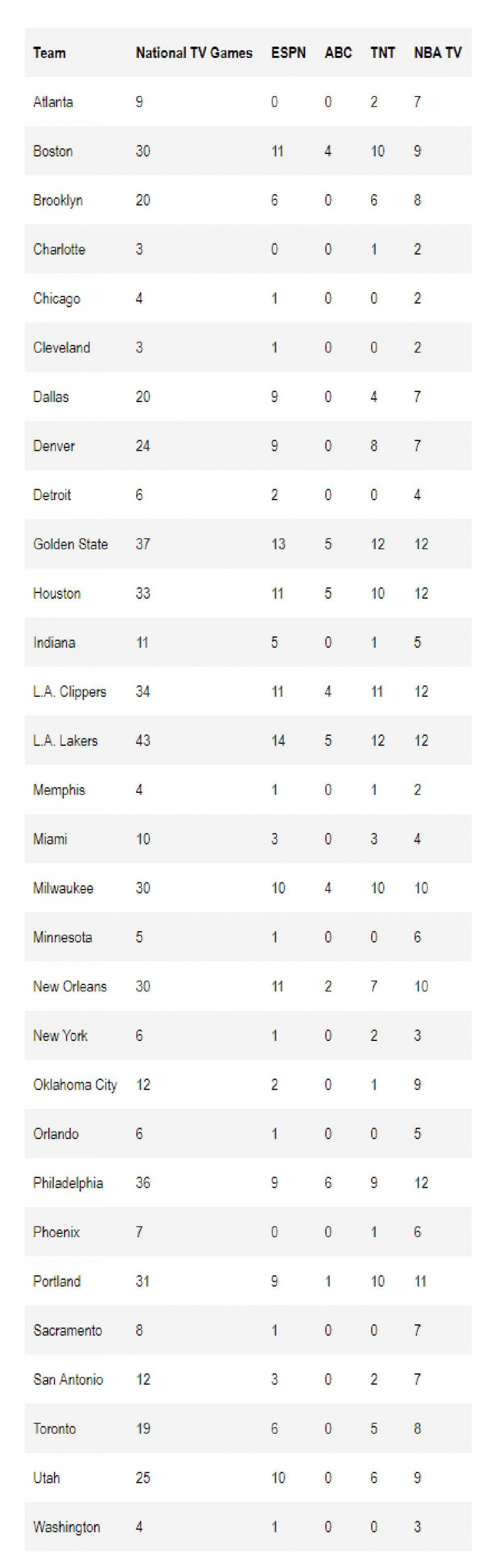 Namun ada empat tim yang mendapat jatah siaran paling banyak. Pertama ada Los Angeles Lakers. Tim ini mendapatkan siaran televisi sebanyak 31 pertandingan di musim 2018-2019 lalu. Kini dengan kombinasi LeBron James dan Anthony Davis, membuat Lakers mendapatkan tambahan 12 kali. Rinciannya, 14 pertandingan di ESPN, 5 laga di ABC, 12 laga di TNT, dan 12 laga disiarkan oleh NBA TV.