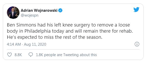 Kabar terbaru muncul dari perkembangan cedera bintang Philadelphia 76ers Ben Simmons. Ia dikabarkan pulang ke Philadelphia untuk menjalani operasi lutut. Diperkirakan Simmons tak akan kembali ke Orlando saat playoff, dan absen hingga akhir musim.