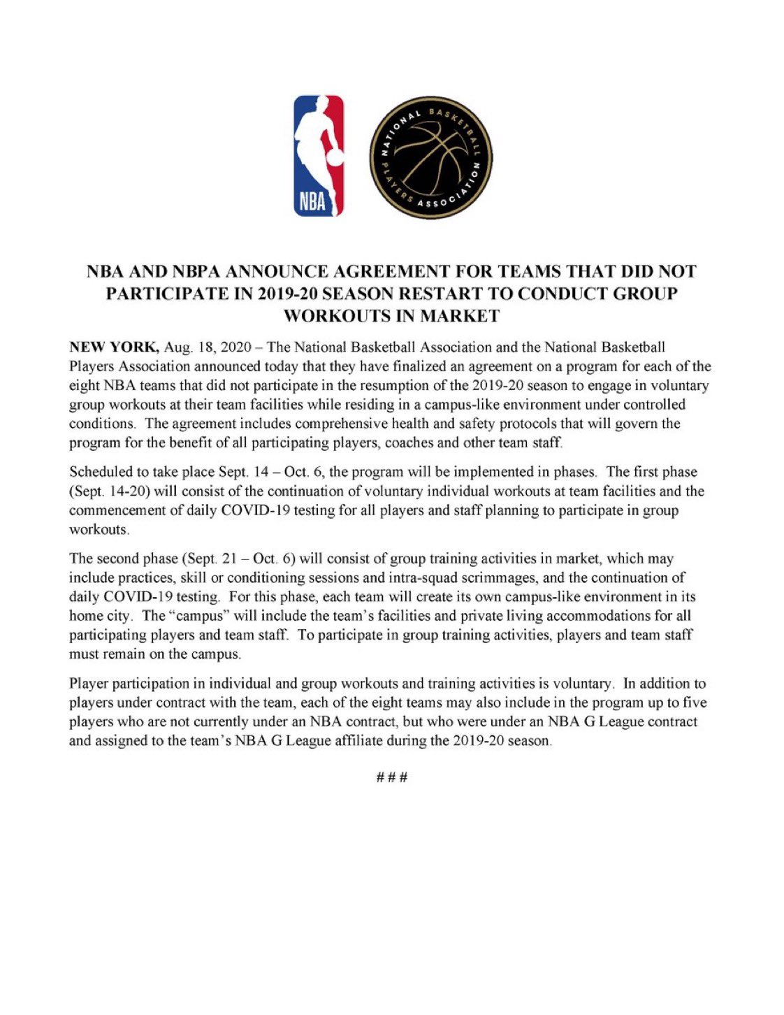 NBA dan NBPA mengumumkan keputusan tersebut pada hari Selasa, 18 Agustus waktu setempat. Mereka dan delapan tim bersepakat tidak akan membuat acara bersama-sama, tetapi akan berlatih bersama di tempat masing-masing. Rencananya, latihan bersama ini berlangsung pada 14 September hingga 6 Oktober 2020.