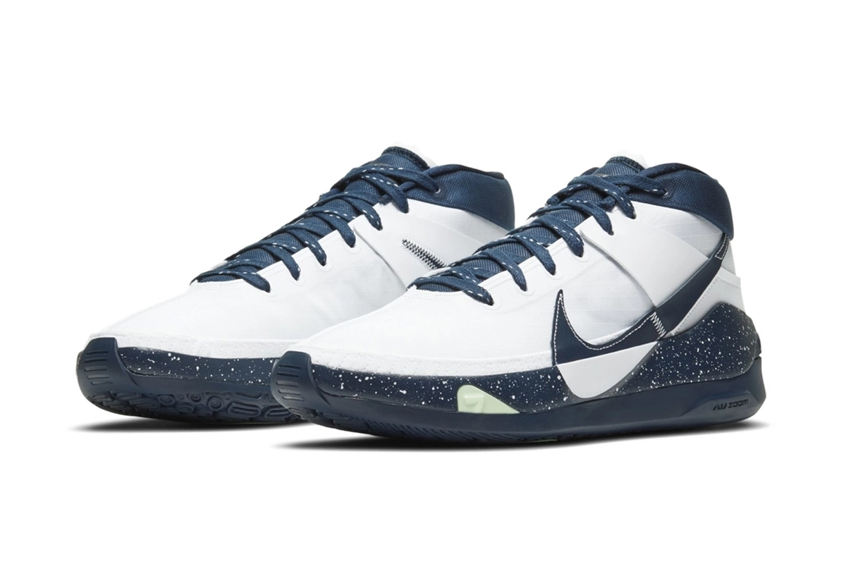Kemudian, yang terbaru ada kombinasi warna biru tua dan putih. Tampaknya memang lebih netral dipasangkan dengan jersei warna apa pun. Ada yang bilang bahwa Durant sedang rindu dengan tim lamanya, OKC Thunder. Tetapi ada bagian yang menjelaskan bahwa dirinya tetap di Brooklyn Nets, yaitu di bagian samping ada nomor tujuh. Nomor punggung yang dipakai Durant di Nets. Seperti yang diberitakan mainbasket.com sebelumnya, bahwa Durant tidak akan meninggalkan Brooklyn untuk musim depan.