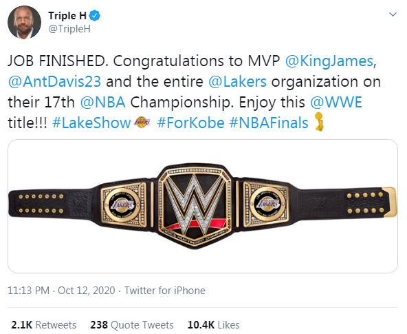 Sementara itu, dari ajang World Wrestling Entertainment (WWE), Triple H yang kini menjadi petinggi perusahaan tersebut akan memberikan sabuk juara untuk Lakers. Triple H mengunggahnya di akun twitter pribadinya.