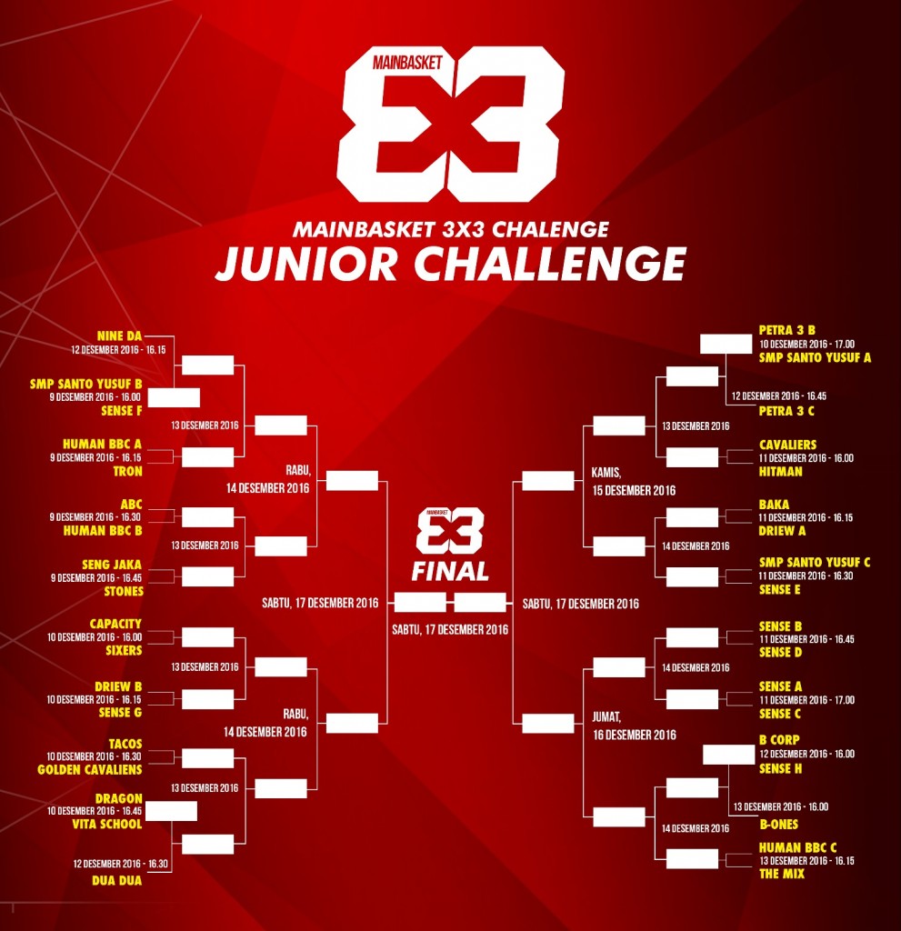 Mainbasket 3x3 Challenge hadir sebagai salah satu supporting event pada gelaran Jawa Pos-Honda Pro Tournament 2016. Ada empat kategori yang ditandingkan yakni Junior (SMP), Senior (SMA), College (Mahasiswa) dan kategori Putri. Gelaran ini akan berlangsung bersamaan dengan Jawa Pos-Honda Pro Tournament 2016 yakni tanggal 9 hingga 17 Desember 2016. Mereka akan bertanding di lapangan 3x3 Atrium DBL Arena Surabaya. Berikut bagan sekaligus jadwal pertandingan Mainbasket 3x3 Challenge