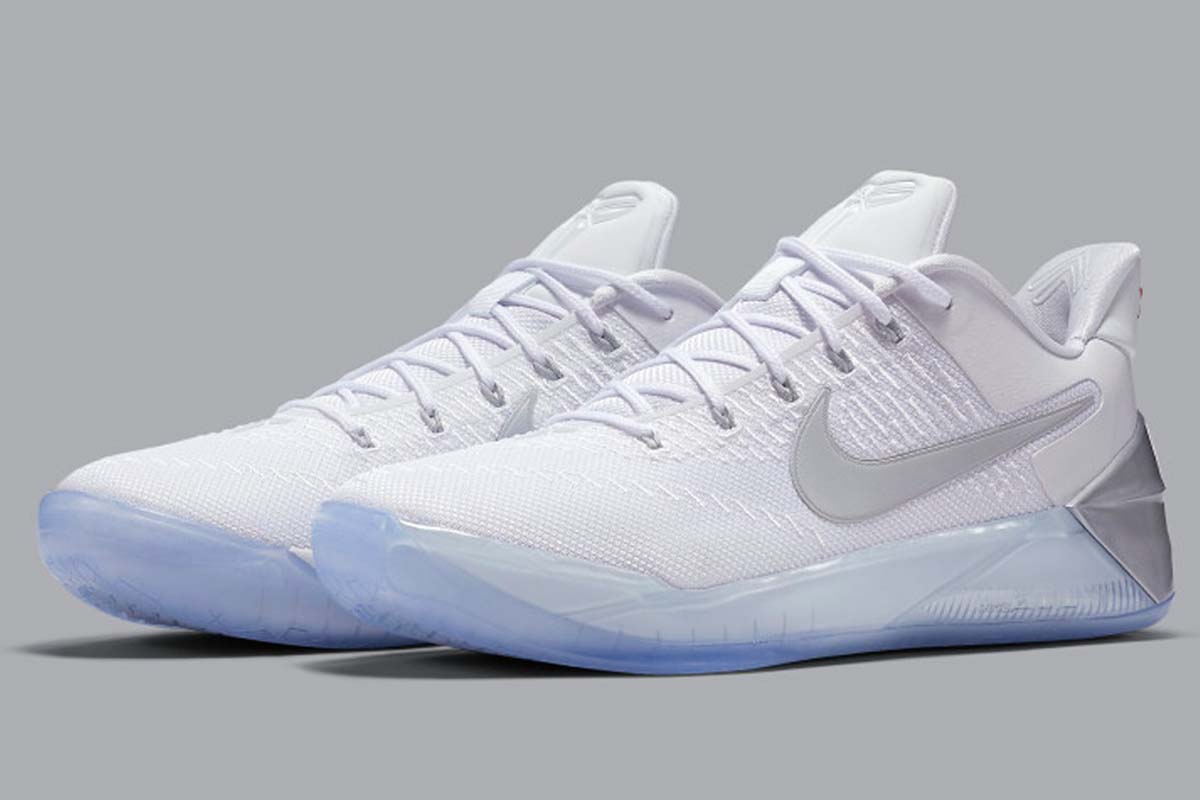 Warna putih bersih sangat dominan di sepatu ini. Namun beberapa sentuhan perak menghiasi detail seperti logo Swoosh khas Nike dan bagian penutup tumit. Di bagian bawah, Nike Kobe AD memakai bahan tembus pandang, sehingga teknologi Zoom Air bisa dilihat dari luar. Selain itu di tapak sepatu terlihat dingin dengan aksen es.
